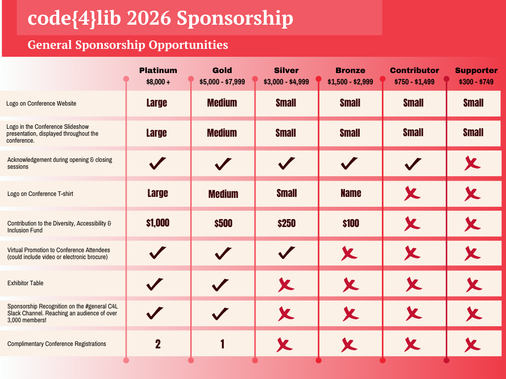 If you would like to pledge your support at any level, or have questions about sponsorship, feel free to email code4lib.sponsorship@gmail.com.